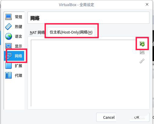 在彈出的界面,選擇”網絡“——”僅主機(host-only)網絡“。點擊如下圖所示的+號添加。