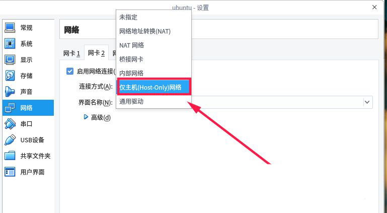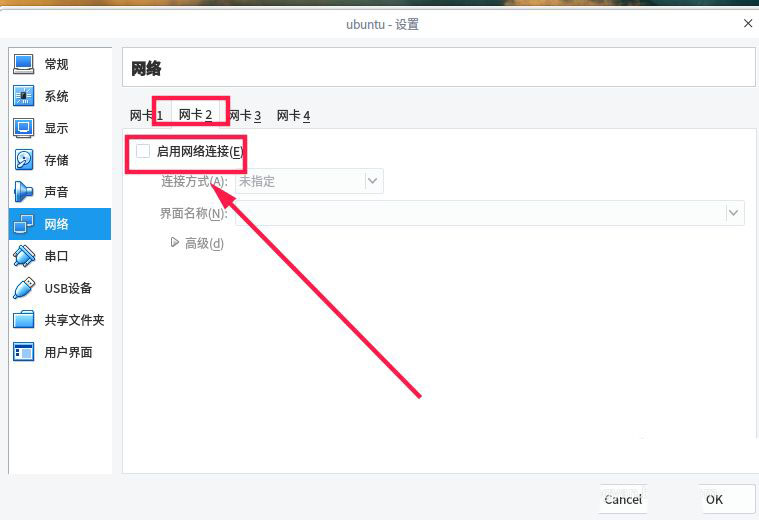 在網絡界面點擊“網卡2”,如下圖所示,勾選“啟用網絡連接”。