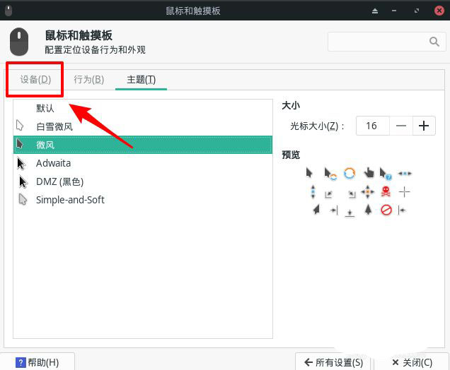 在【鼠標和觸摸板】中,切換到【設備】選項卡。