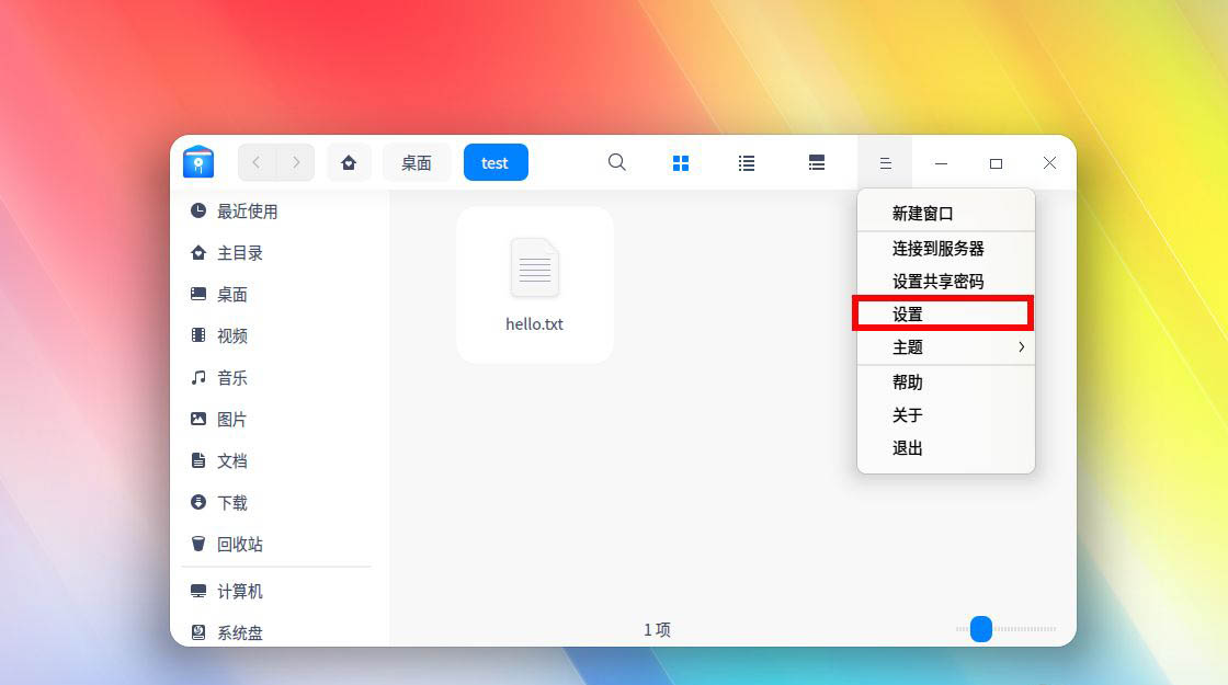在文件夾窗口的右上角選擇菜單,在菜單的列表中我們找到 設置 選項。