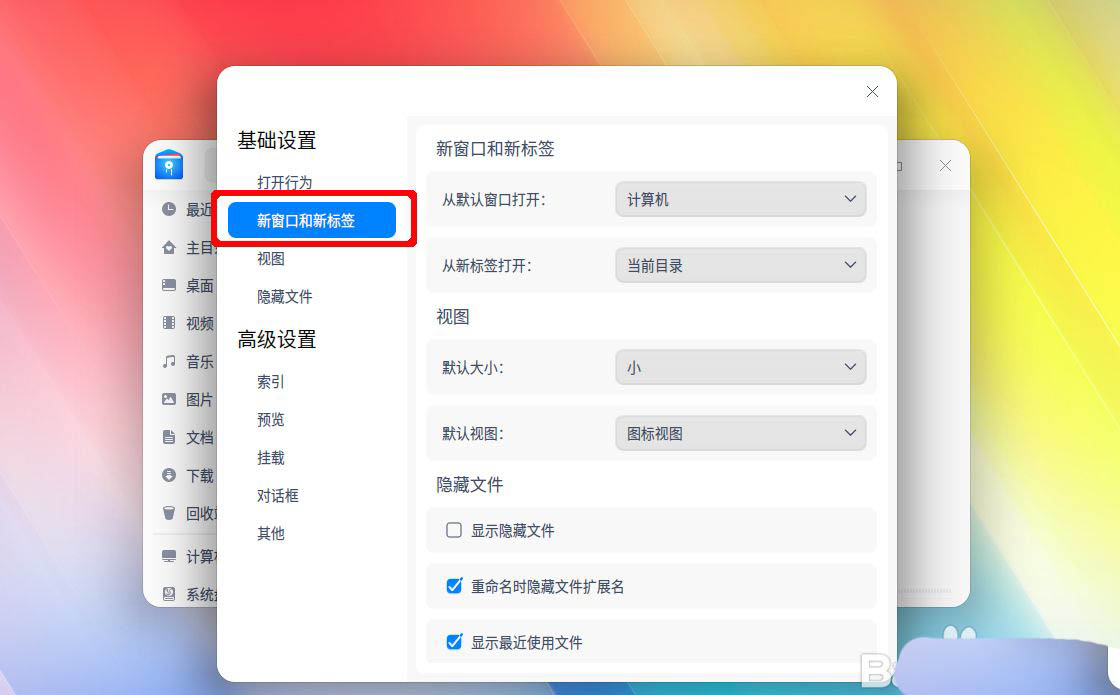 在彈出的窗口中,我們在基礎設置中選擇左邊的 新窗口和新標簽。