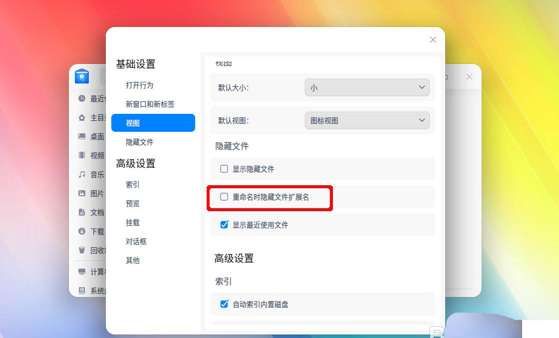 右邊我們像下面劃動,在隱藏文件里面有三個選項,我們取消勾選 重命名時一藏文件擴展名。