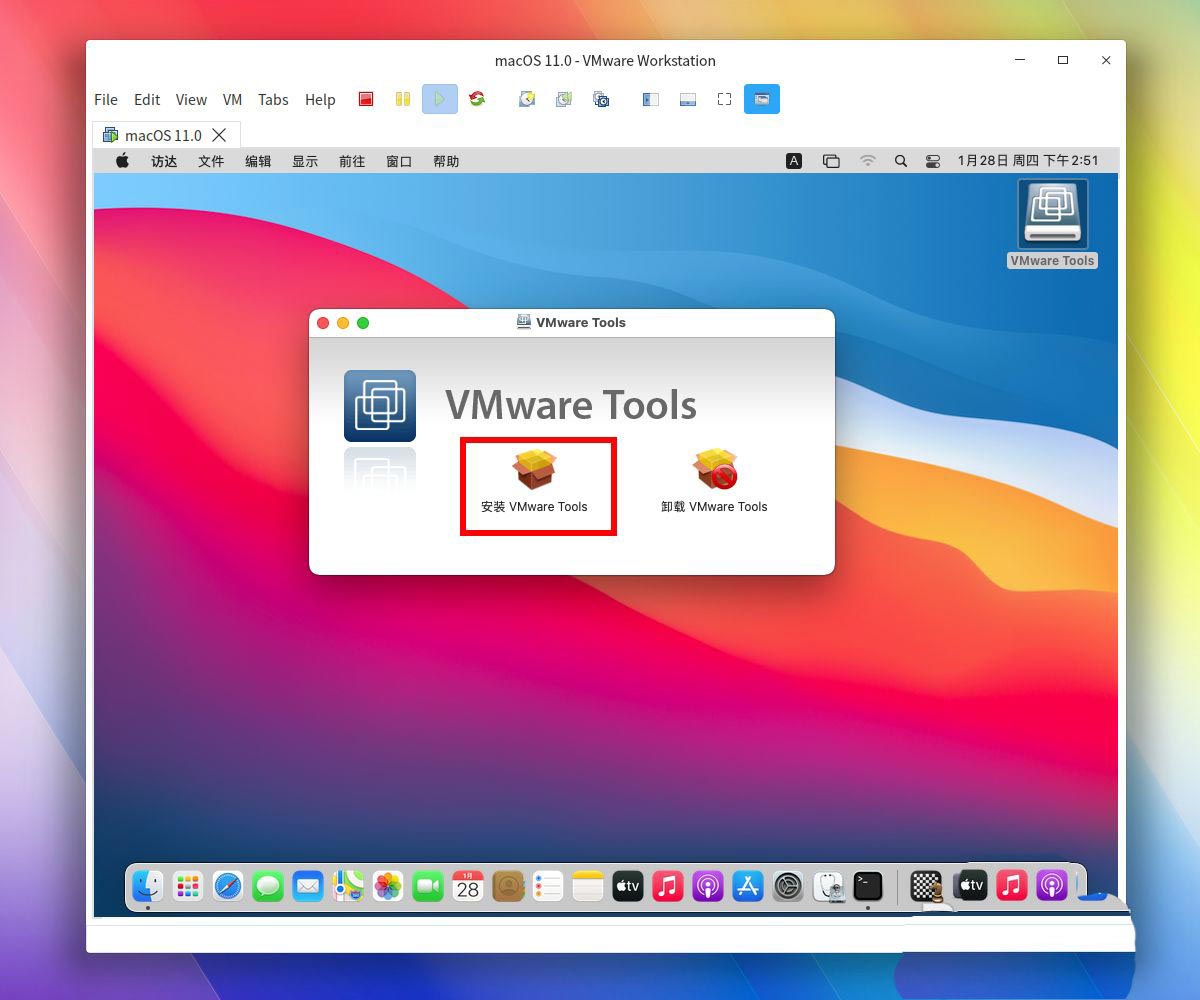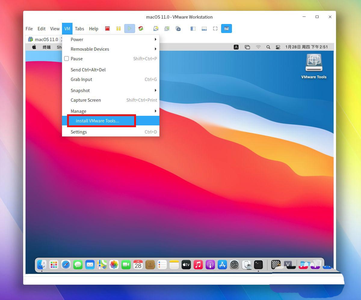 接著我們打開自己的vmware中的macosx11虛擬機系統窗口,在頂面菜單中選擇VM--install VMware Tools...。