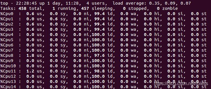 在Linux中可以通過top指令查看某一進(jìn)程占用的CPU情況,也可以查看某一個CPU使用率情況(先top指令,然后按數(shù)字“1”鍵即可顯示每一個CPU的使用情況),如下圖:
