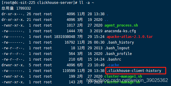 - ~/.clickhouse-client-history (隱藏文件) 所有通過交互式命令行執行的sql歷史記錄。可使用ll -a命令查看