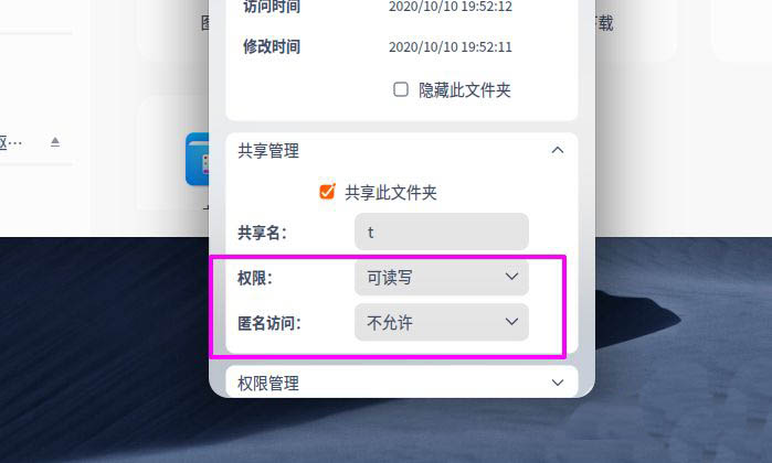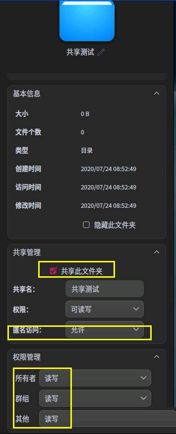 勾選【共享文件夾】后,下方的權限和匿名選項即可進入可設置狀態。