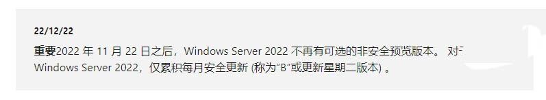 我們還了解到,微軟表示 2022 年 11 月 22 日之后,Windows Server 2022 不再有可選的非安全預覽版本。對于 Windows Server 2022,僅累積每月安全更新 (稱為“B”或更新星期二版本) 。