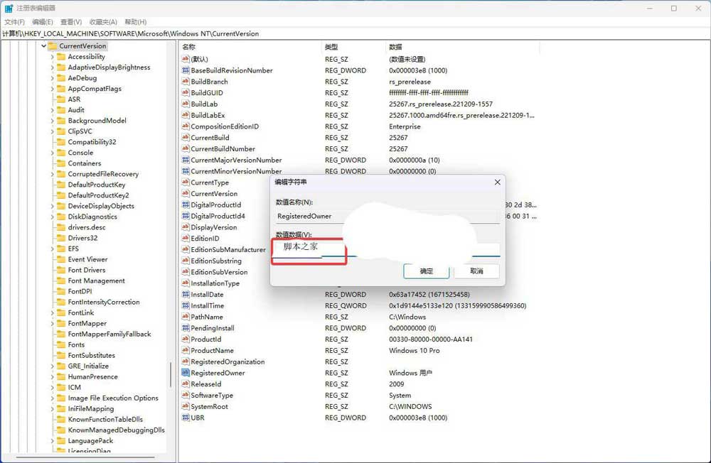 4. 雙擊 RegisteredOwner,修改為你想要的設(shè)備用戶名稱(chēng),例如這里小編修改為“”
