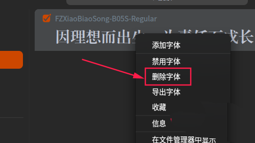 4、右擊需要刪除的字體,在彈出的快捷菜單中,選擇【刪除字體】。