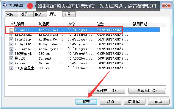 第四步我們將不需要的開啟啟動項勾選去掉,也可以全部去掉,加快電腦的開機速度,點擊確定進行保存,如下圖所示: