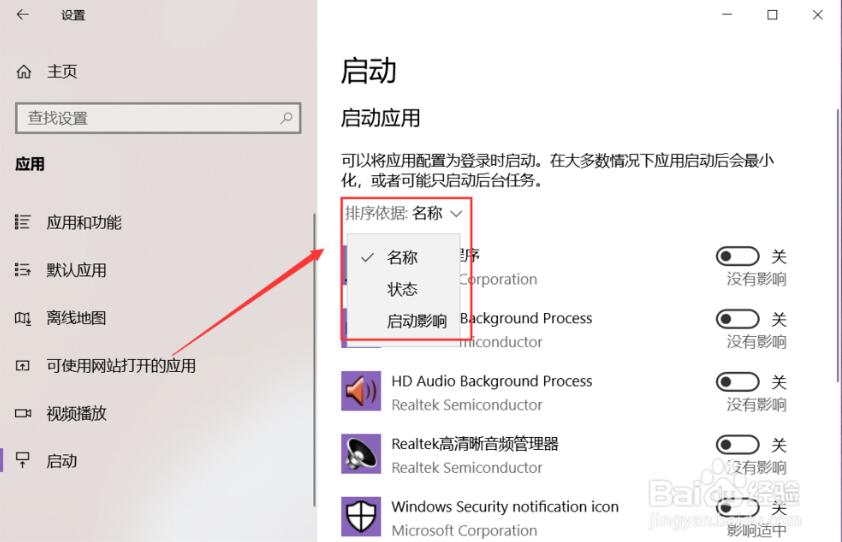 如果應用過多,還能點擊如圖位置的“排序依據”,根據應用名稱、狀態、啟動影響等元素對列表中的應用進行排序。