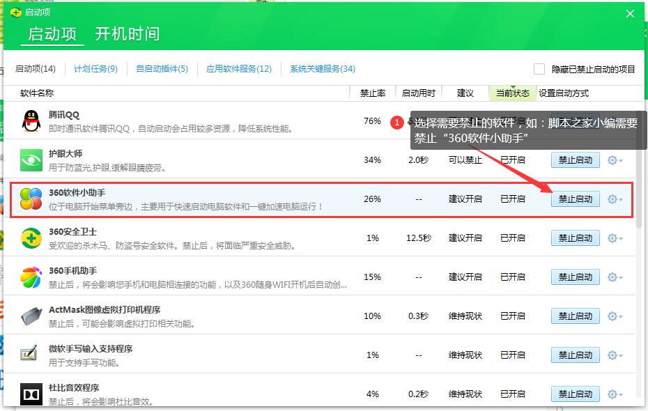 如:大家需要將“360軟件小助手”關閉,那就點此后面點擊“禁止啟動”;如圖