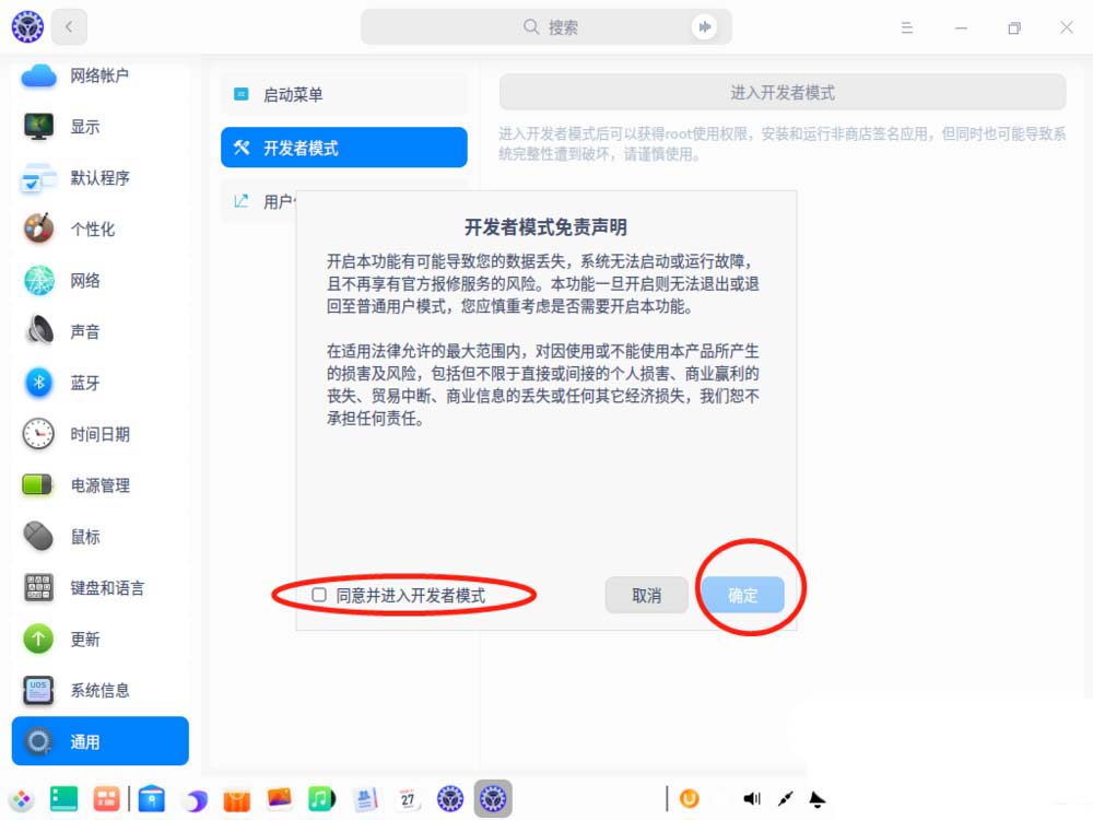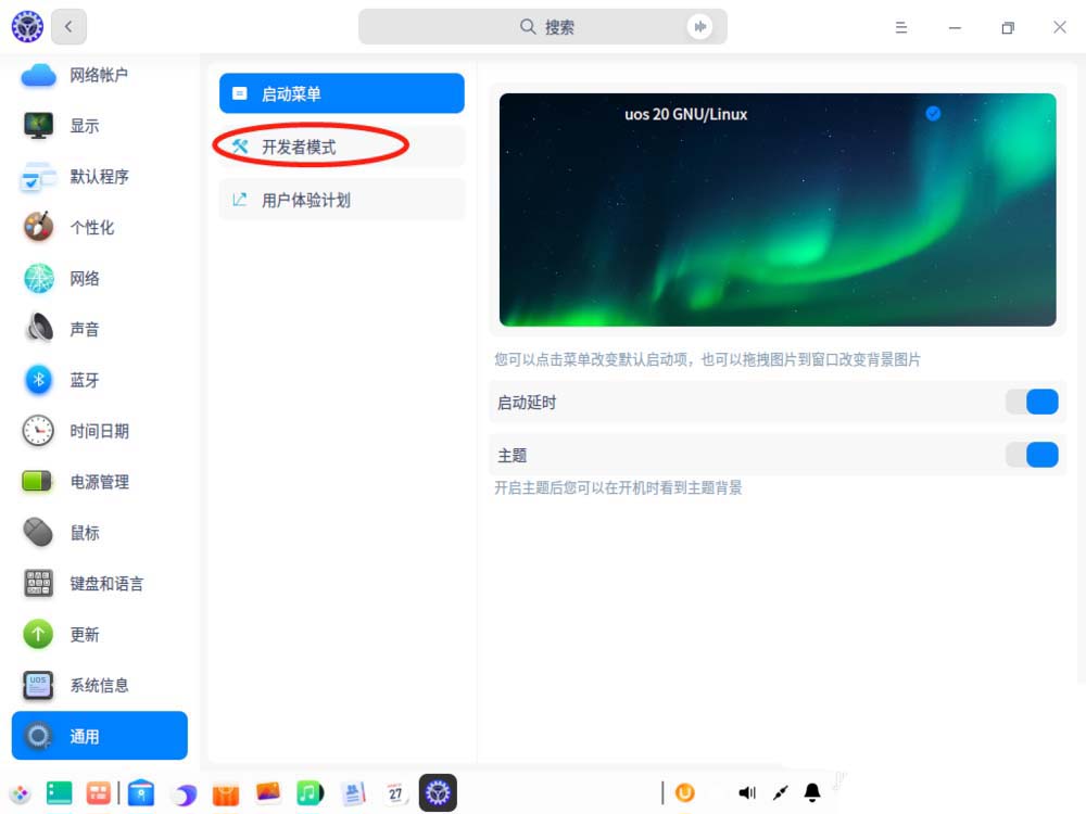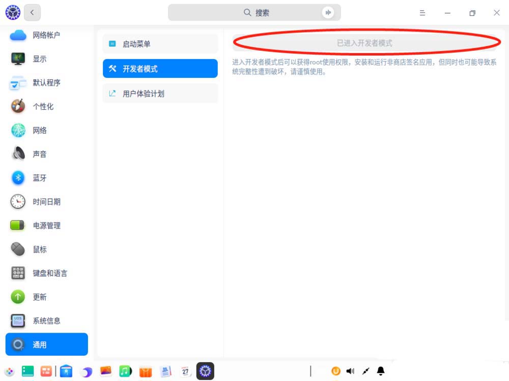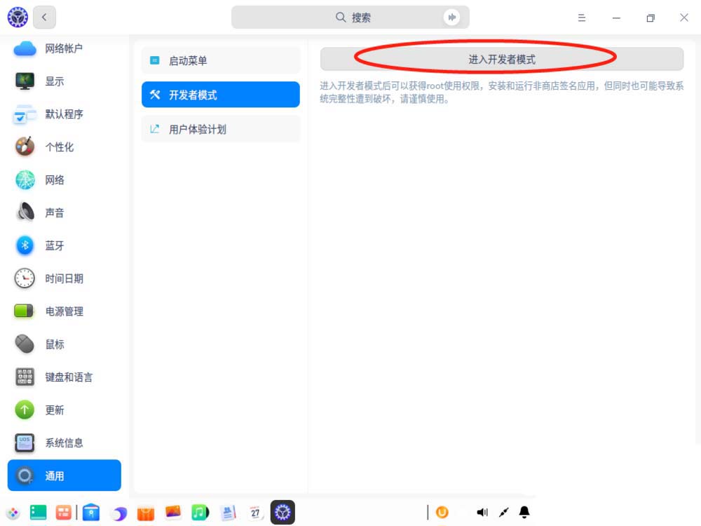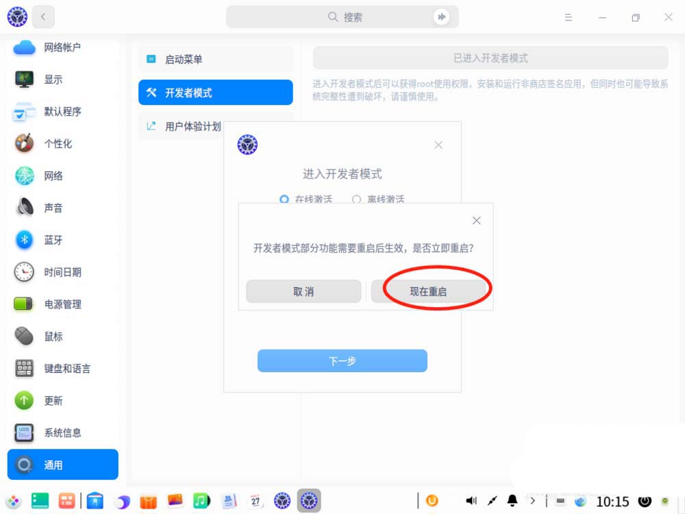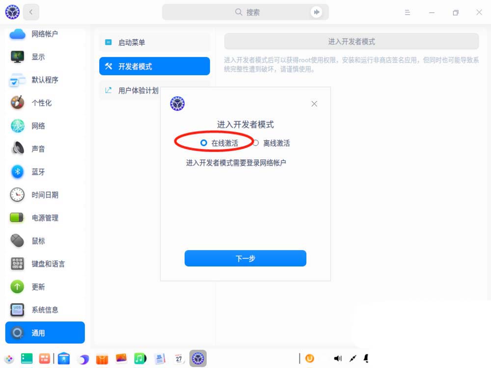 對于已經聯網的設備可以直接轉到UOS系統的控制中心(即設置)、通用、開發者模式、在線激活即可開啟該模式。