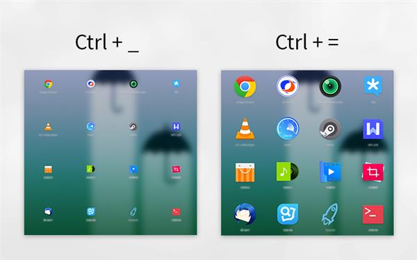 在高分屏設(shè)備上,系統(tǒng)會(huì)自動(dòng)適配一個(gè)最合適的圖標(biāo)大小;在普通設(shè)備上,可以自由地通過(guò)快捷鍵和滾輪(Ctrl =/- 或Ctrl+滾輪)對(duì)圖標(biāo)進(jìn)行縮放。
