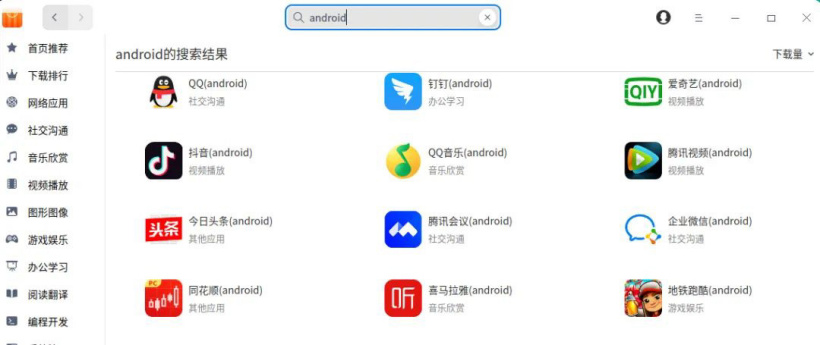 打開統(tǒng)信 UOS 系統(tǒng)應用商店,搜索“Android”,后綴有 (android) 即為安卓應用,或打開應用商店首頁底部《安卓同樣也精彩》專題,找到應用,點擊“安裝”即可。