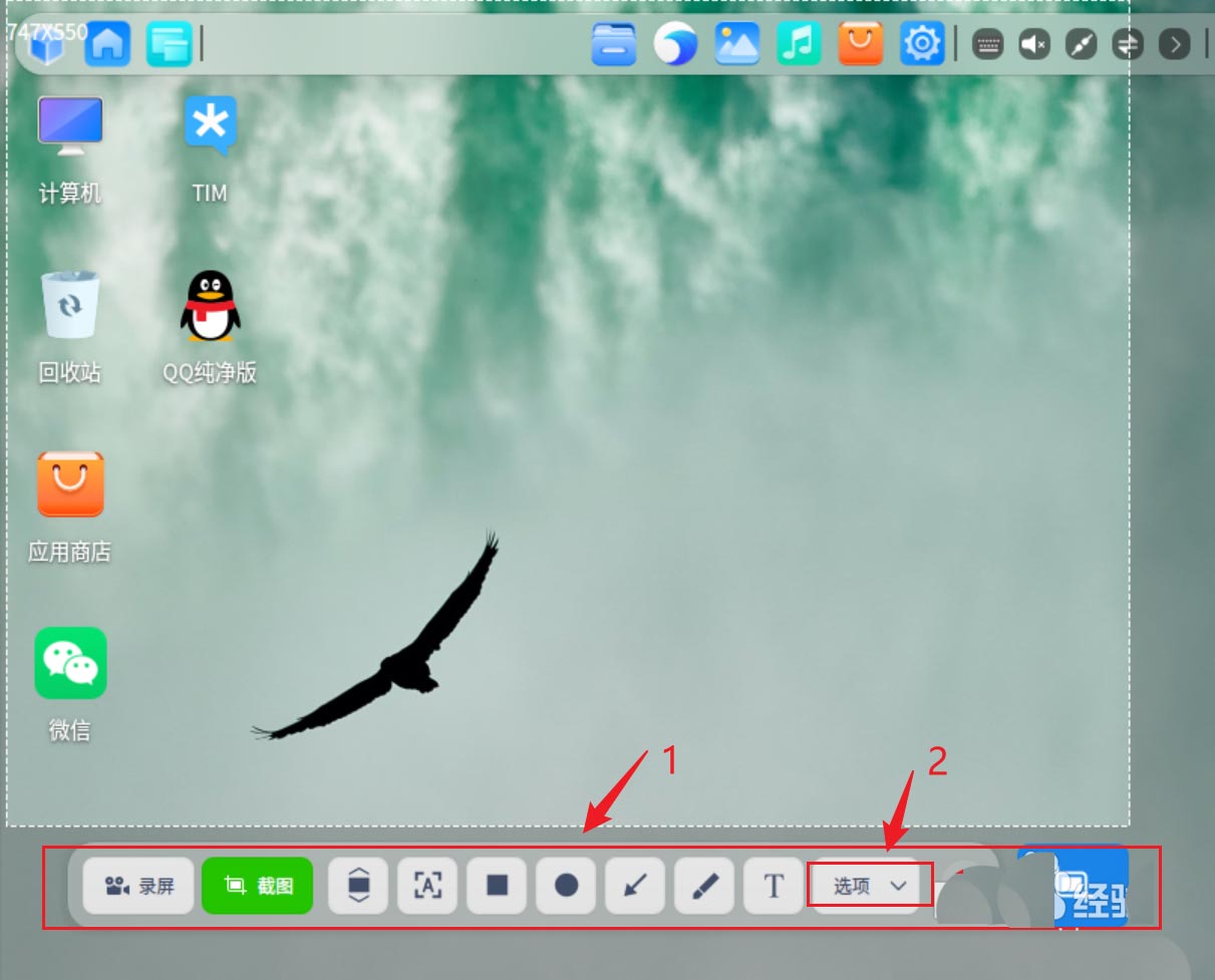 選中截圖區(qū)域,之后會看到截圖工具欄,單擊【選項】。
