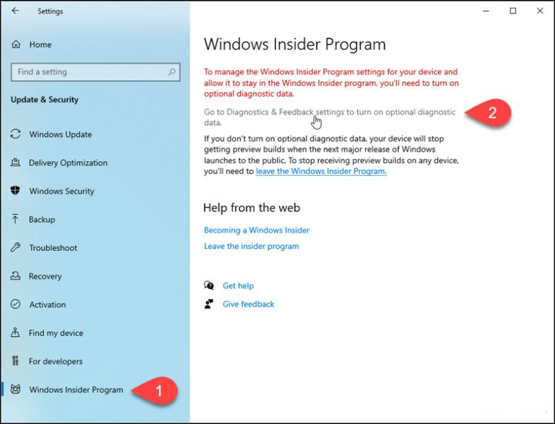轉(zhuǎn)到Windows 預(yù)覽體驗計劃屏幕,然后單擊轉(zhuǎn)到診斷和反饋設(shè)置以打開選項診斷數(shù)據(jù)。