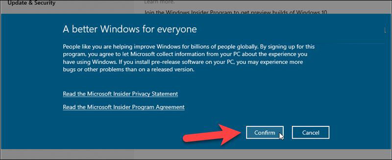Pick your Insider settings彈出對話框中,選擇Release Preview Channel并單擊Confirm。