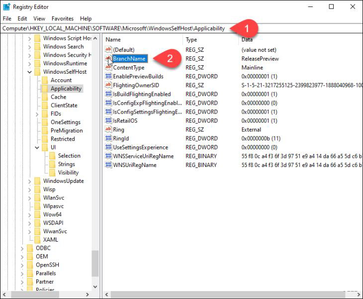 接下來,導(dǎo)航到以下鍵:HKEY_LOCAL_MACHINE\SOFTWARE\Microsoft\WindowsSelfHost\Applicability雙擊BranchName鍵并將Data 值更改為Dev。