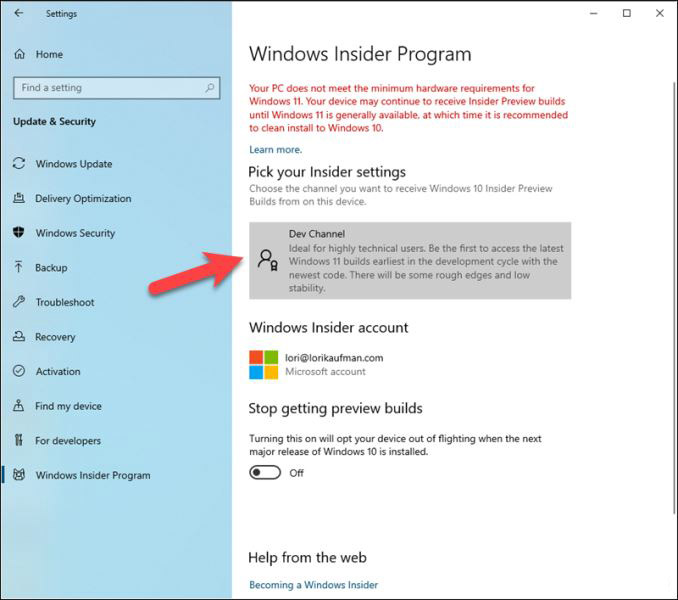 您應(yīng)該在Pick your Insider settings下看到Dev Channel。