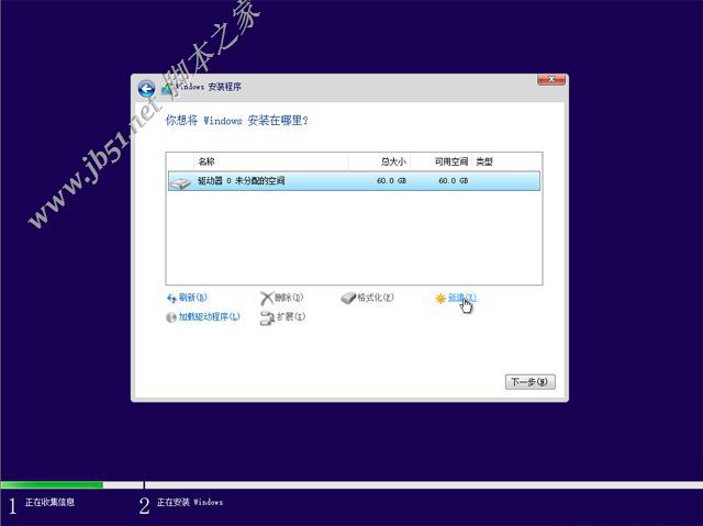 8、進入到分區界面,如果之前有系統,要先備份好數據,格式化系統所在的分區,執行第12步,如果要重新分區,要先刪除所有分區,只剩下一個未分配的空間,選擇未分配的空間,點擊【新建】;