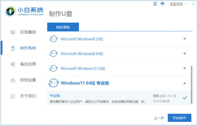 2.此時我們打開【小白一鍵重裝系統(tǒng)】工具,進入頁面后,點擊“制作系統(tǒng)”,準備制作一個win11系統(tǒng)的u盤啟動盤。