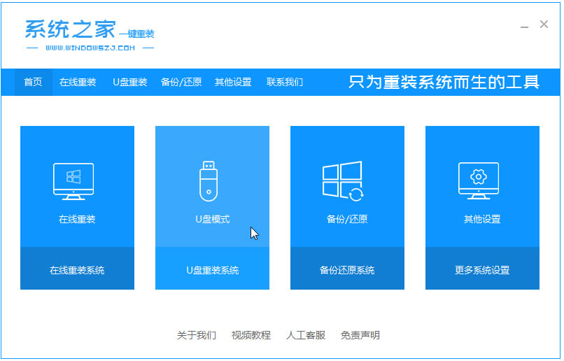 1.xp系統(tǒng)iso下載后如何安裝?首先我們下載一個(gè)“系統(tǒng)之家一鍵重裝系統(tǒng)”工具,然后在頁(yè)面中選擇”u盤(pán)模式“。