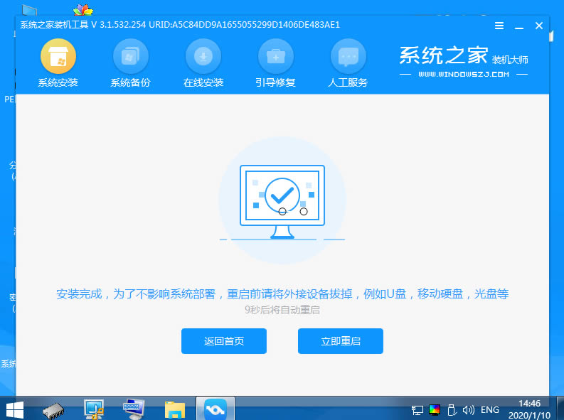 9.等待系統(tǒng)成功安裝后,它提示安裝已完成,取出U盤(pán)并重新啟動(dòng)計(jì)算機(jī)。