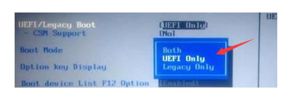 2、boot啟動選項下方可以看到有“LEGACY only”、“UEFI only”和“UEFI and LEGACY”三種選項,選擇uefi選項即可,按下F10保存退出重啟電腦即可。