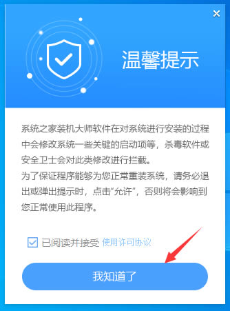 1、首先現在系統之家裝機大師,建議關閉所有的殺毒軟件,然后打開系統之家裝機軟件,軟件會進行提示,仔細閱讀后,點擊我知道了進入工具。