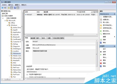 5、依次展開,Microsoft--Windows--Maintenance,在右側可以看到WinSAT,可以看到這里顯示的是每周執行一次的