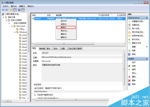 6、選中WinSAT,并右鍵,選擇”禁用“,這樣狀態變成了禁用了,以后這個工具就不會再運行了