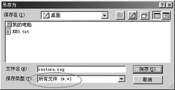 保存此文件,在打開的“另存為”對話框中選擇好保存路徑,再單擊“保存類型”中的下拉箭頭選擇“所有文件”(一定要選擇此步,不然保存后的文件會自動加上TXT的擴展名),然后在“文件名”中輸入“restore.reg”后按“保存”按鈕(如圖1)。以后你就可以通過雙擊這個restore.reg來直接解除禁用注冊表的限制。