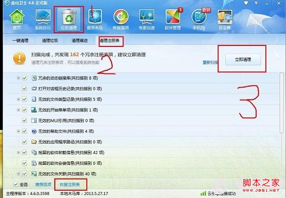 利用超級兔子、優(yōu)化大師、安全衛(wèi)士一系列的第三方軟件清理,下面小編就以金山衛(wèi)士為例,打開主界面,找到垃圾清理-清理注冊表,開始掃描清理即可,金山衛(wèi)士會自動把注冊表備份,就不用我們在單獨(dú)備份了,要是出了問題也容易恢復(fù)。