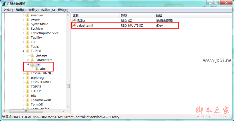 [HKEY_LOCAL_MACHINE\SYSTEM\CurrentControlSet\services\TCPIP6\try\abc]