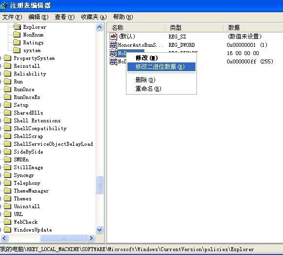 3、選中Explorer,在右側空白處右鍵單擊選擇“新建 -> 二進制值”,然后將新建的鍵值名稱修改為“NoDrives”