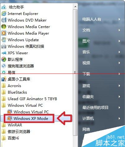 1、點擊Windows7操作系統中的開始菜單→所有程序→Windows Virtual PC→Windows XP Mode
