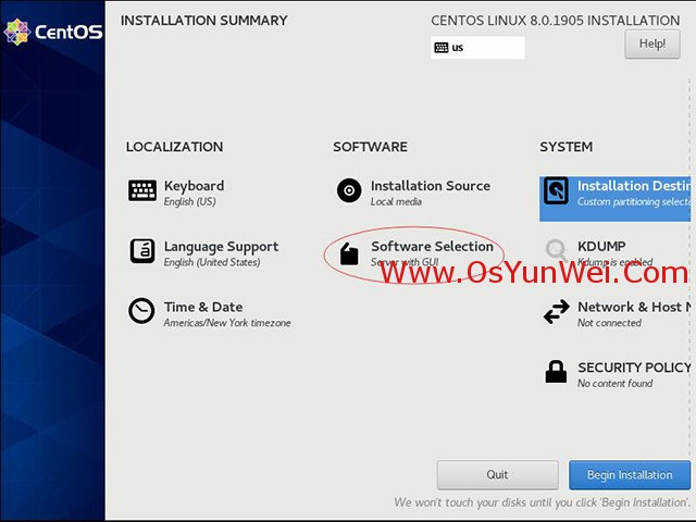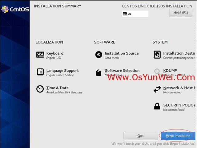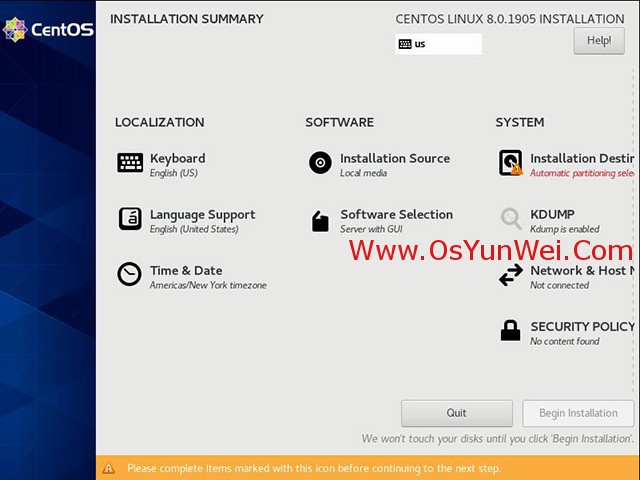 截止目前CentOS 8.x最新版本為CentOS 8.0.1905,下面介紹CentOS 8.0.1905的具體安裝配置過程