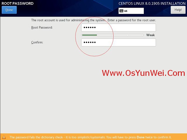 如果密碼長度太短會出現提示,設置好后要確認兩次,安裝繼續。