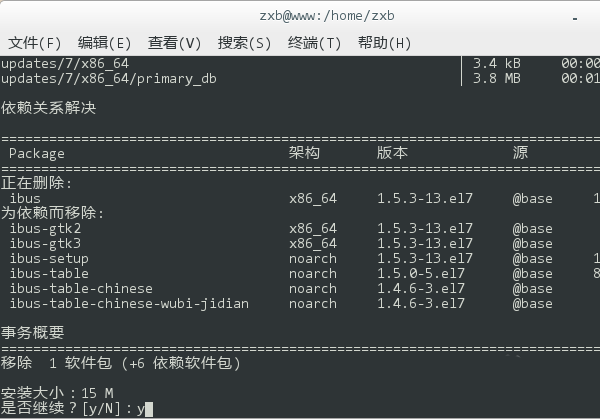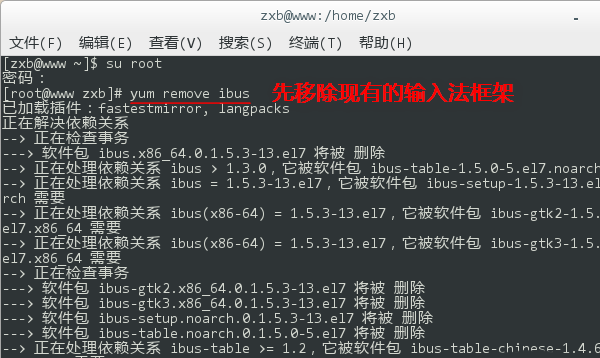 3、登錄 root 后,再鍵入 yum remove ibus,移除現有的輸入法框架。