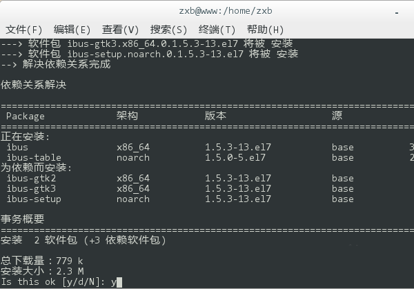 5、移除完畢后,再鍵入 yum install ibus ibus-table,回車后重新安裝輸入法框架。同樣,在執行過程中會詢問是否確認安裝,鍵入 y 回車繼續。
