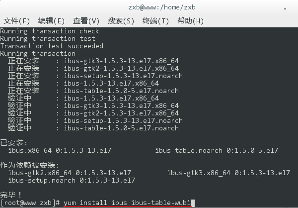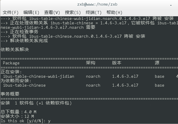 6、然后,輸入 yum install ibus ibus-table-wubi 安裝極點五筆輸入法,并且在執行過程中鍵入 y 確認下載和安裝。