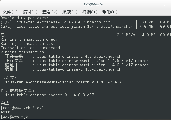 7、安裝成功后,鍵入 exit 退出 root 帳號,然后再關閉終端窗口。當然,你也可以不退出直接關閉終端(這會在關閉時彈出一個警告提示框,直接無視即可),這是沒有關系的。