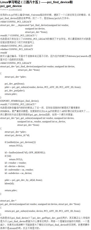 用Xilinx PCIE demo的時(shí)候,編譯了一個(gè)xapp1022提供的Linux驅(qū)動,出錯(cuò)提示找不到pci_find_device函數(shù)。說明上說這個(gè)驅(qū)動是fedora上的,當(dāng)前環(huán)境是Centos7。驅(qū)動中使用的頭文件只有一個(gè)linux/pci.h與pci有關(guān),所以進(jìn)去看了一下,沒有。