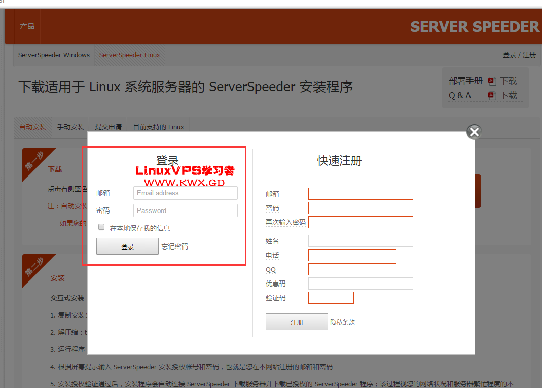 1、到銳速官網(http://my.serverspeeder.com/)注冊并登陸一個帳號,以便授權。