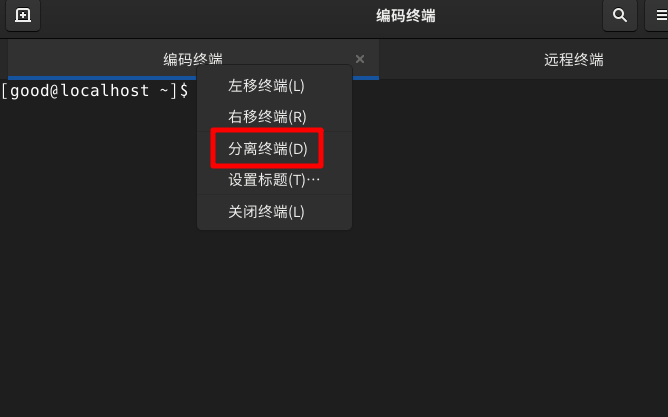 5、用戶如果不喜歡使用標簽頁的狀態,可以在標簽頁上右鍵選擇【分離終端】。