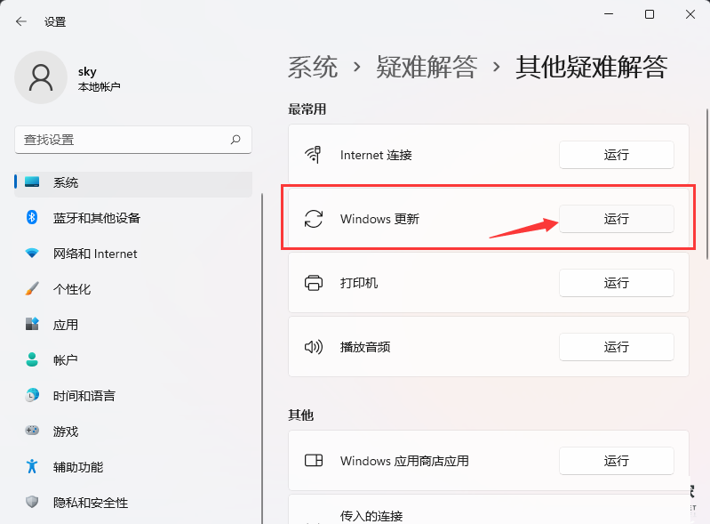 4、當(dāng)前路徑為:系統(tǒng) 》 疑難解答 》 其他疑難解答,最常用下,點(diǎn)擊Windows 更新旁邊的【運(yùn)行】;