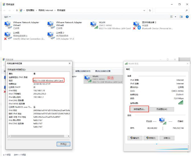 4、點擊 物理機 “控制面板”- “網絡和Internet” -”網絡連接“,選一個可用的網絡,以太網或者WLAN,記住網卡名稱:如 ”802、11n USB Wireless LAN Card”。
