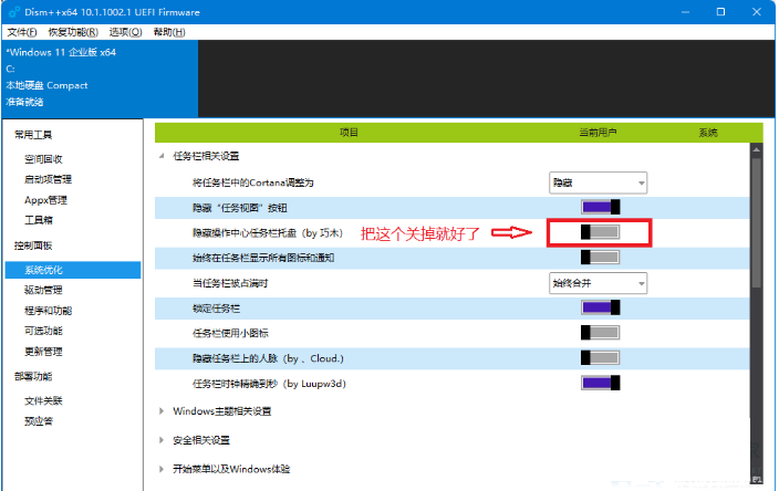 類型:優化設置大小:3.03MB語言:簡體中文時間:2022-11-28查看詳情2、右鍵以管理員身份運行Dism++ 64位,將 “隱藏操作中心任務欄托盤” 關閉。