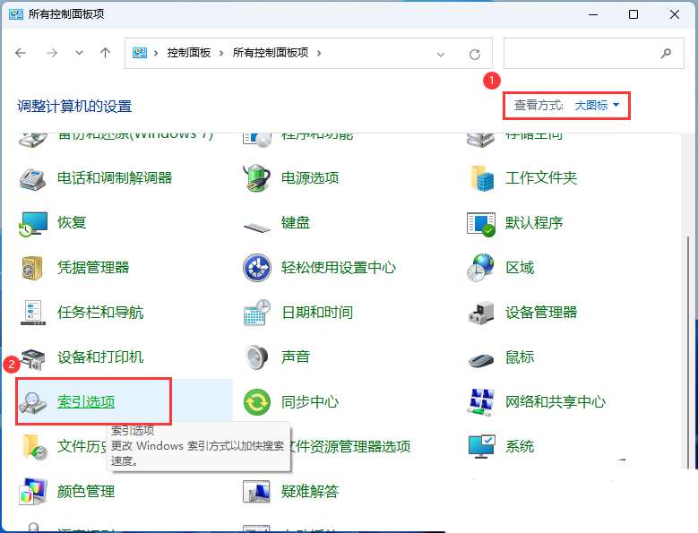 3、所有控制面板項窗口,切換到【大圖標】查看方式,調整計算機的設置下,找到并點擊【索引選項】;